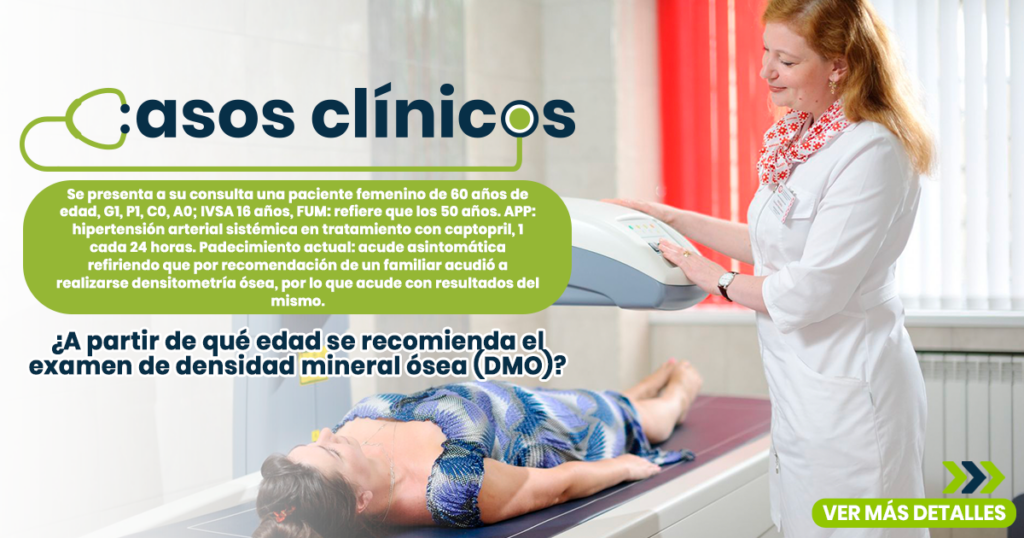 Se presenta a su consulta una paciente femenino de 60 años de edad, G1, P1, C0, A0; IVSA 16 años, FUM: refiere que loas 50 años. APP: hipertensión arterial sistémica en tratamiento con captopril, 1 cada 24 horas. Padecimiento actual: acude asintomática refiriendo que por recomendación de un familiar acudió a realizarse densitometría ósea, por lo que acude con resultados del mismo.